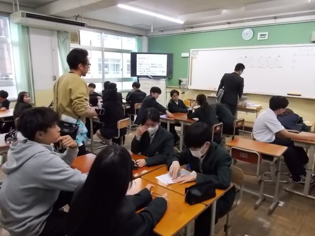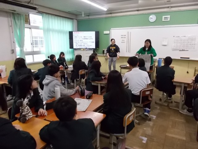 2年生は各教室で破れた新聞紙をグループで協力して記事に並べ替えるゲームなど、