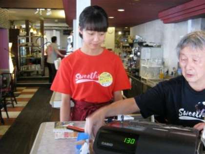 はじめての接客もがんばっています。事前学習で手を組むときは,「前で,右手を下に」と学んだことをしっかり守っています。