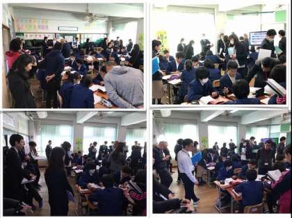 2月4日(火) 6限目1年生4組教室にて小中連携 第二回研究授業、研究協議が行われました。第一回は小学校の教諭が、今回は本校の教諭が授業を行いました。第一回、第二回両方とも道徳で研究授業を行いました。