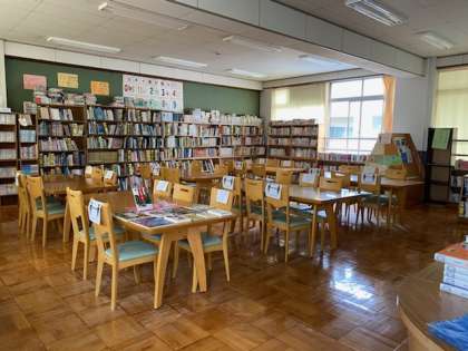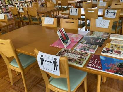 写真は、図書室の様子です。図書室内もソーシャルディスタンスを取れるよう学校司書さんに工夫をしていただきました。