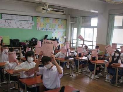 今年は体育館に全員が集まることがしにくいので,生徒総会をテレビ会議システムを使って行いました。生徒会本部の皆さんがフリップをもって文字や結果を示すとともに,はっきりした口調で話してくれてたことと,テンポよく進めてくれたので,とてもわかりやすかったです。