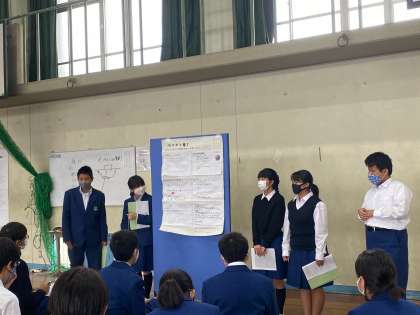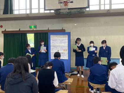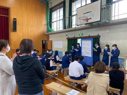 11月4日(水) 5、6限体育館にて、1年生の総合的な学習の時間の発表会が行われました。夏休み中のSDGs の調べ学習から始まった総合的な学習の時間の取り組み。SDGsをレンズにして、自分たちの住んでいる京都について、様々な視点で探究活動を行ってきました。今日はグループでのポスター発表を行いました。保護者の皆様も参観に来てくださり、オーディエンスとして参加してくださいました。中には、生徒たちの力を高めようと、発表についていい質問をしてくださる保護者の方もおられました。
