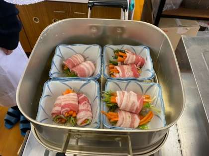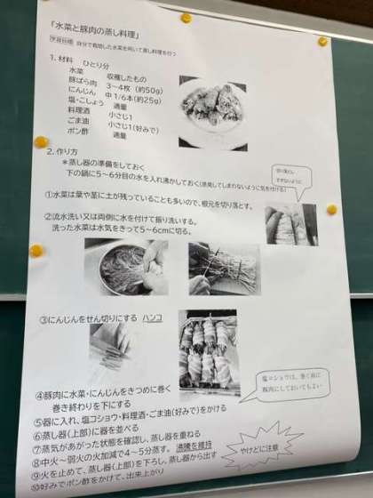 12月8日(火) 2年生の2クラスが、技術で栽培した水菜を使って家庭科で調理実習を行いました。水菜と人参を豚肉で巻いて蒸していました。