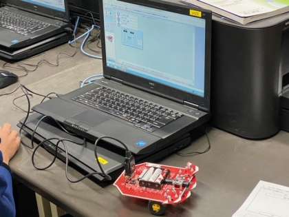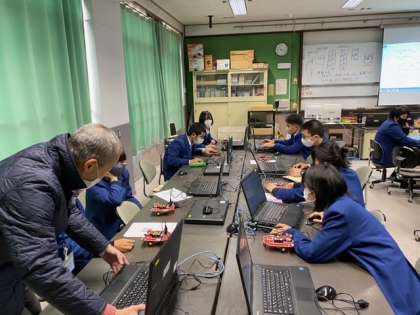 1月5日(火)2限、技術の授業「プログラミング」の授業の様子です。コンピューターでプログラミングをし、ロボットの指令を設定します。それをロボットに同期させ、指示通りロボットを動かせます。3年生の諸君は、一生懸命がんばってプログラミングしていました。