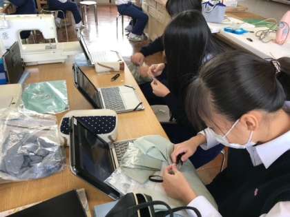 タブレットで裁縫の方法の動画を見ながらバッグを作成しています。わからないところは、各々がその部分を繰り返し動画を再生し自己解決しながら行なっています。