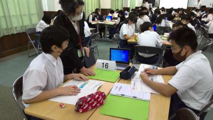 7月6日(木)1年生は生き方探究館に行き、「ジョイ JOB LAND」という就活体験活動に参加しました。午前中は、京都中央信用金庫の方々がお話してくださいました。大事にしていることや普段どんな仕事をしておられるのかなどを聞いたあと、業務体験として「おんゆあ商店街を活性化する企画書の作成」にチャレンジしました。「無料券の配布」や「SNSの活用」、「イベントの開催」など、思いつく限りのアイデアを出し合い、グループで企画書としてまとめました。アイデアを出すのもまとめるのも一苦労でしたが、どのグループも真剣に話し合い、一生懸命取り組んでいる様子がとてもよかったです。生き方探求館の先生方にも、「みんなで取り組んでいるのがすごいですね。」とほめていただきました。創意工夫しながら、時間内にまとめることは、きっとこれからの学校での学習にも役に立つと思います。いい経験をしましたね。