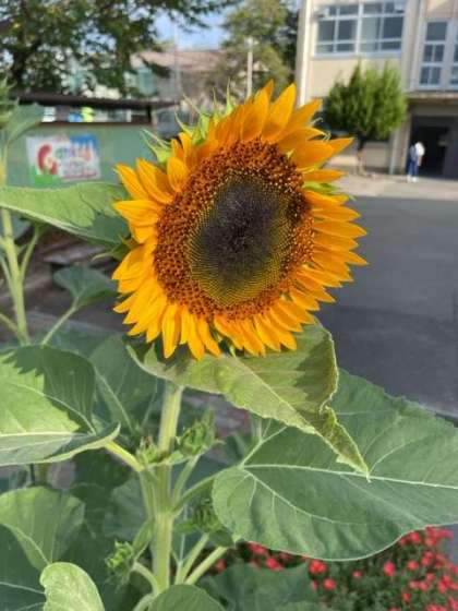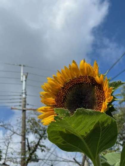 19日(火)先週から開花をまだかと待っていましたひまわりです。3つほど大輪の花が咲きました。これからも続いて咲いてくれそうです。みんなに元気を与えてくれます。