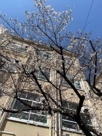 4月1日(月) 校内の桜も今日の暖かさで一気に開花が進みました。来週の始業式、入学式まで咲き続けてくれる事を祈ってます!