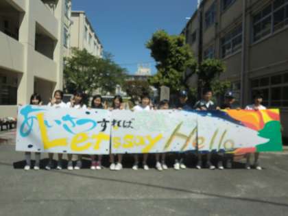 今年度は,「あいさつをしよう」を学校の重点目標として,学校全体で,生徒会で,地域で活動を行っています。生徒会の今年のスローガンも「あいさつをしよう」〜あいさつをすれば友だちいっぱい〜です。生徒会本部で大きな看板ポスターを作りました。