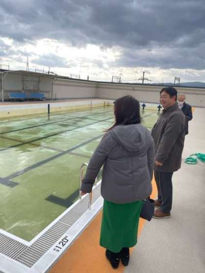 今回は部活動を理事の方に見てもらい、その後に協議を行いました。今後の部活動のあり方などの話もあり、課題の共有ができたように感じます。施設見学で屋上のプールなども見てもらいました。