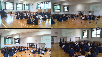 今日の4限目に武道場で3年生が学年道徳を行いました。学年の道徳係3人が進行をし、「どっちみちカンケーないし」という題材で行いました。レストランで注文しすぎて残してしまう“息子”を「世界には餓死する子供がいるんだぞ!」と注意する“お父さん”や、新しい服を買ったから着られる服を捨てる“姉”を「着るものがなくて困っている人がいるからもったいない!」と注意する“妹”。“息子”や“姉”の「どっちみちカンケーないし」について意見交流しました。グループに分かれて活発な議論が行われていました。