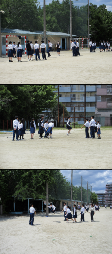 青空の下、昼休みにグラウンドで1年生が大縄跳びの練習をしていました。どのタイミングで跳べばよいか、またどれくらいの速さで縄を回せばよいかなど、それぞれ仲間と相談しながら練習をしていました。練習を重ねるごとにコツを掴んだ人が徐々に増え、跳ぶ回数も増えていきました。