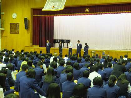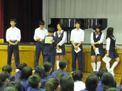 春季総合体育大会の報告を各部活動のキャプテンが行いました。写真も大きく映し出され,それぞれに頑張った様子がうかがえました。夏季大会にむけて頑張ってください。また生徒会の今年度のスローガン「支え・励まし・高め合う桃陵中学校」も発表されました。