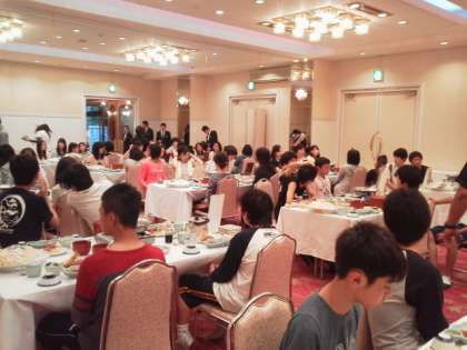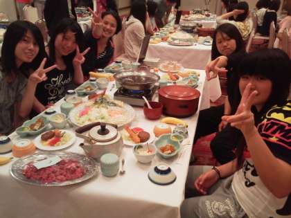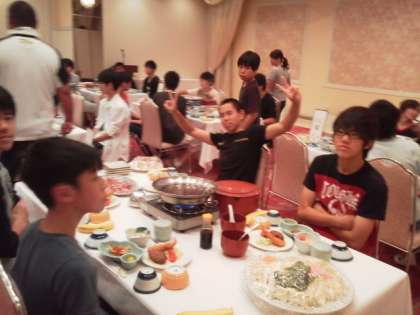 夕食はすき焼き。昼御飯が早かったのでお腹はペコペコです。全員非常に元気です。夕食後はレクです。本日最終のアップです。
