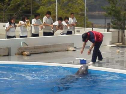 九十九島水族館海きらら。イルカショーをプールサイドで見ました。みんな満面の笑顔。