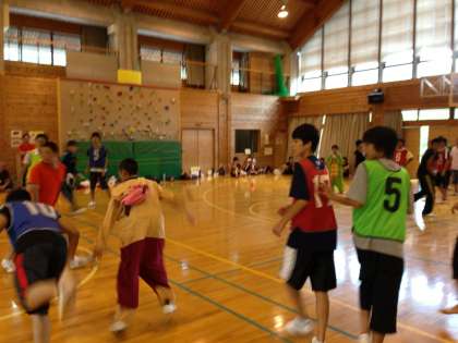 TSSの西京極中学校との交流でドッジボールを行いました。白熱した生徒の試合の合間に教師の試合も行いました。「王様ドッジ」だったので王様役の両校校長先生には着ぐるみを着ていただきました。