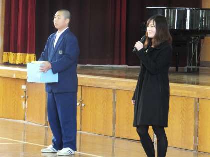 毎年,生徒会本部役員が中心となり書き損じハガキ・使用済みインクカートリッジを回収し,NPO法人テラ・ルネッサンスへお渡ししています。今年も,全校集会でお渡しし,お話をうかがいました。