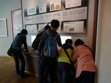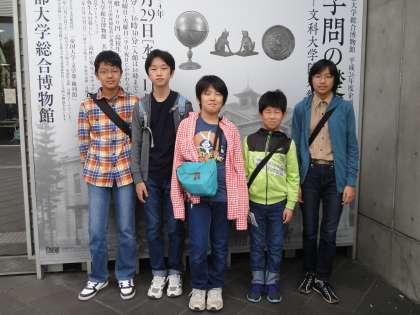 10月25日(土)フィールドサイエンス部が京都大学総合博物館に行ってきました。衛生通信技術のコーナーでは,地球全体から日本,京都,桃陵中学校までアップで見ることができ,「発見!○○先生の車やぁ〜」という声もありました。化石コーナーでは,ナウマンゾウの復元像の前でパチリ!入り口での記念撮影です。化石体験,簡易プラネタリウム体験など職員の方とのふれあいも持てた半日でした。
