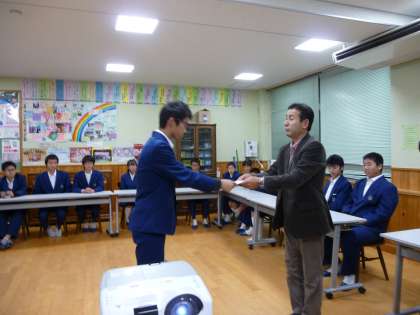 11月5日(水)塩竃市立浦戸小中学校の伊東教頭先生に本校にお越しいただき,大手筋などでの義援金活動で皆様からお預かりした義援金をお渡ししました。生徒会の新旧本部役員がこれまでの活動に様子を写真等で見て振り返りながら,これからも活動を続けていく思いを述べました。