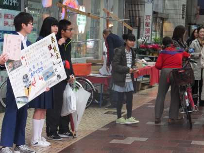11月29日(土)PTAの人権啓発街頭運動に合わせて,桃陵中学校生徒会と伏見南浜小学校児童会が協力して,人権啓発しおり配りと義援金活動を大手筋商店街で行いました。今回は義援金を宮城県塩竃市立浦戸中学校で役立てていただいている写真なども掲げました。