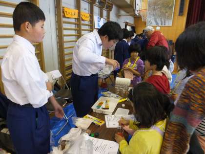 11月14日(土)伏見南浜小学校で恒例の南浜ふれあい広場が行われました。南浜各種団体連絡協議会が協力して,地域の子どもたちのために,楽しい遊びを提供しています。本校も吹奏楽部がオープニングで演奏を行い,今年はフィールドサイエンス部の16人が「科学のマジック」というブースを企画運営しました。スーパーボールづくりや色水マジック,逆さゴマづくりなど小学生,園児に大好評でした。