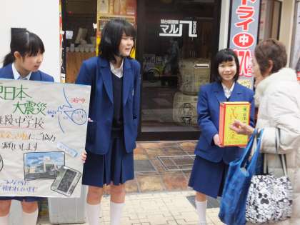 2月26日(土)大手筋商店街で生徒会本部が東日本大震災義援金活動を行いました。新本部役員にバトンタッチされてから2回目の活動ですが,それぞれが思いを込めたメッセージで訴えていました。ご協力ありがとうございました。