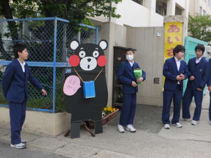 本日も地域の方,保護者の方が直接学校に持ってきてくださいました。校門前の生徒会本部の子どもたちも心を込めて呼びかけています。