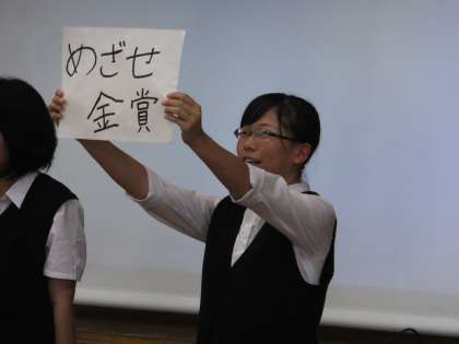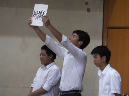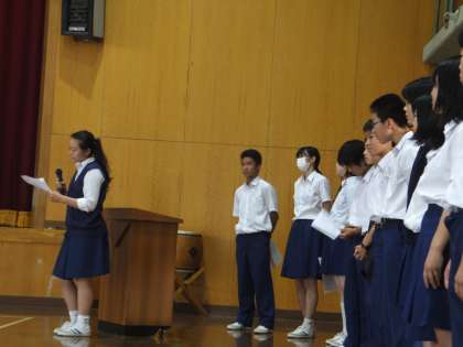 2年生チャレンジ職場体験の報告会と夏季大会の結団式・激励式を生徒総会で行いました。各部活動のキャプテンが夏季大会に向けての言葉を画用紙に書いて示し,大きな声で決意を述べました。みんな集中して参加した充実した集会でした。生徒会本部の緻密な計画と実行力のたまものです。