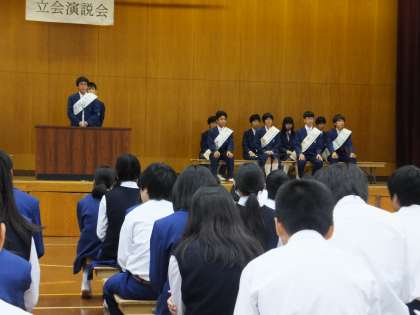 10月28日(金)生徒会本部役員選挙に先立ち,立会演説会を開催しました。立候補者,応援者すべての子どもたちが,原稿を読むことなく堂々と立候補理由や公約などを述べました。見てる子どもたちも,静まり返り,音は拍手だけという,まさしく「ご清聴ありがとうございました」の演説会でした。その後,クラスに戻り投票を行いました。