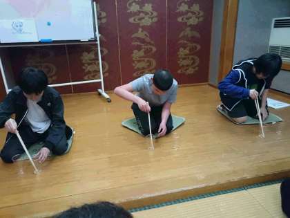 いよいよ最後のゲームです。ラストは、豆つかみ競争です。長い菜箸で大豆をつまんでカップに移します。それをクラス全員でリレーして競っています。