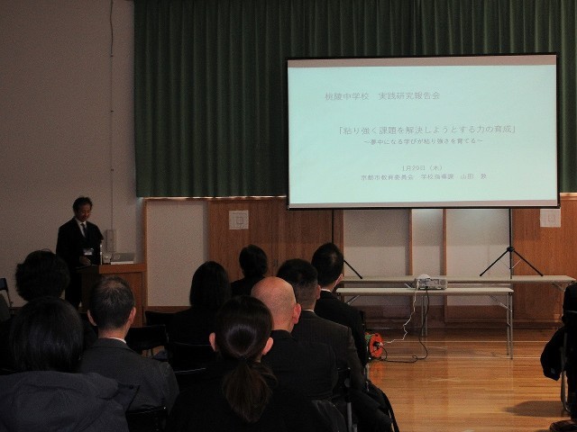 本日の午後から実践研究報告会を行いました。公開授業では、数学・理科・英語と総合的な学習の時間を行い、どの授業でも生徒たちの楽しくいきいきとした姿がありました。全体会では、京都市教育委員会の方から本日の講評等をしていただきました。本日いただいたご意見を参考にさせていただき、引き続き生徒たちの学びのために授業改善をしてまいります。本日は大変多くの方にご来校いただき、誠にありがとうございました。