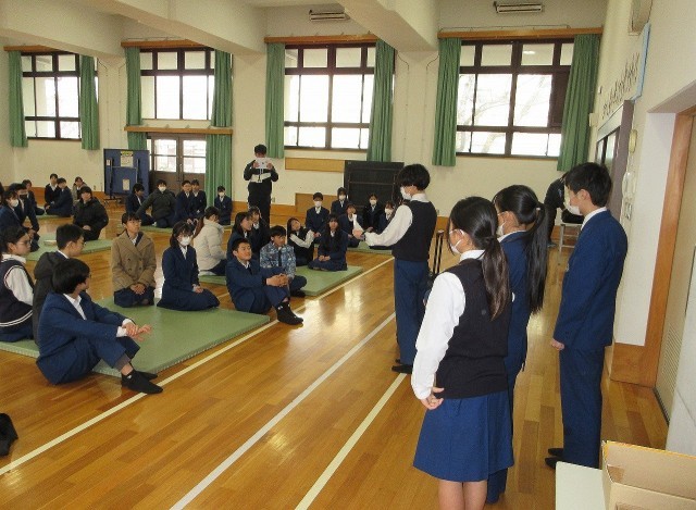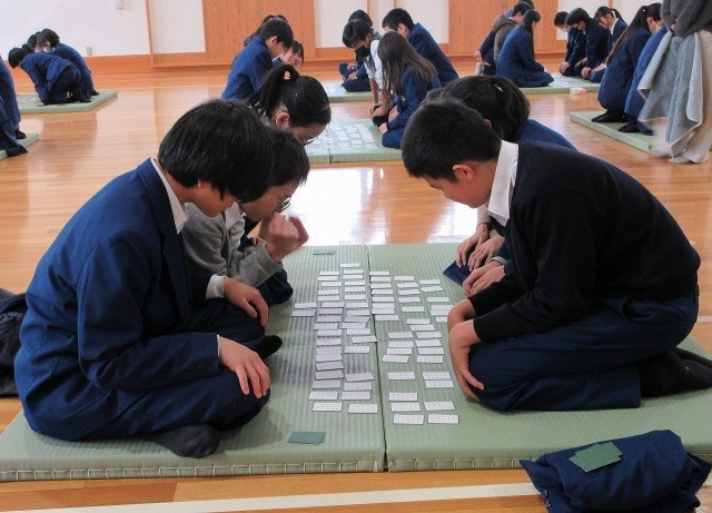 3,4時間目に武道場で行われました。読み手は先生です。だんだんと盛り上がっていきます。後半は一首ごとに歓声が上がり、白熱していました。