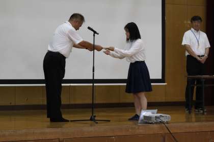 本日20日(木)2限に体育館で休業前全校集会を開催しました。生徒会本部が中心となっての校歌斉唱から始まり,伝達表彰を行いました。伝達表彰では「向単検定満点賞」,育成学級合同球技大会・美術・保健・英検などたくさんの表彰があり,本当に向中生の頑張りは素晴らしいです。