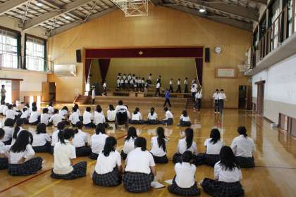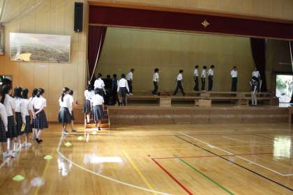 本日8日(金),1年生は体育館において「音楽コンクール」に向けての練習を行いました。舞台への入退場など,一生懸命取り組んでいました。初めての「音楽コンクール」ですが,クラスが一致団結して練習に取り組んでください!!期待しています。