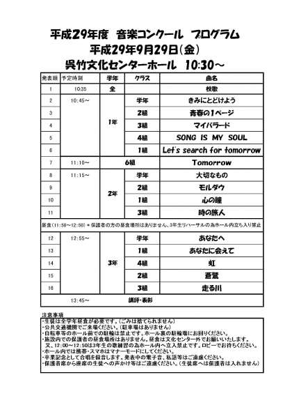 なお「音楽コンクール」のタイムテーブルにつきましては,ページ右下の配布文書または以下のリンクをクリックしてご覧ください。