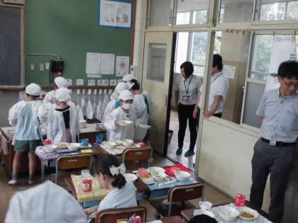 本日21日(木)の午後に向島南小へ本校教職員が給食配膳の様子や試食,授業参観をさせていただきました。1年生から6年生までの各教室に行かせていただき,児童と一緒においしく給食を食べさせていただきました。また,小学校給食についての説明もしていただきました。その後,活気のある授業を見せていただきました。小中一貫校に向けてつなげていきたいと思います。