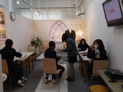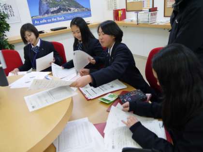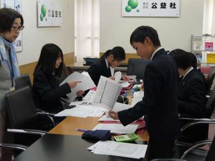 「ファイナンスパーク」は校舎の中に銀行,店舗等からなる「街」を再現し,生徒は設定された一人の社会人として行動します。そのことによって,自らの生き方につながる生活設計能力を育成することや働いて収入を得ることの大切さ,学校での学習が社会につながっていることを理解することを目的としています。1年生は,一生懸命考えながら1日行動していました。