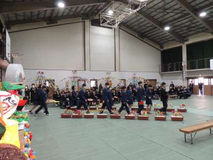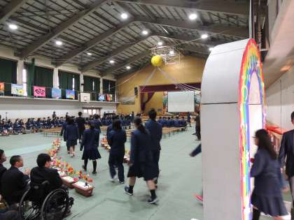 本日13日(火),1・2限に体育館におきまして「3年生を送る会」を実施しました。生徒会本部や各委員会が本当に一生懸命準備してくれました。また,それぞれの学年や6組が熱いメッセージや合唱をを披露してくれました。思い出に残る素晴らしい送る会でした。3年生入場の様子です。
