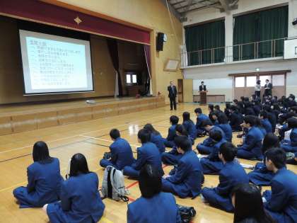 着任式後,引き続き平成30年度の始業式が行われました。校歌斉唱のあと,校長先生からは『今年度は「挑戦」と「感謝」と「つながり」,さらに「笑顔」を大切にしよう』という話に続き,2・3年生を担当する教職員方や部活動の顧問の先生方を紹介されました。