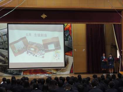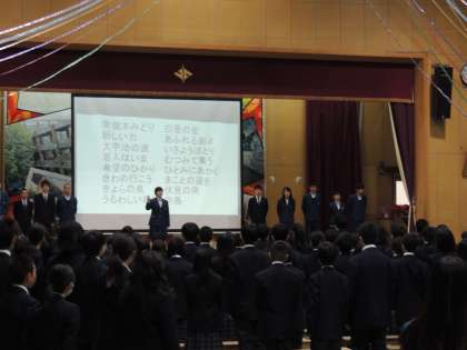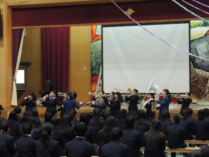 吹奏楽部の演奏,校歌斉唱の後,1年間の生徒会行事の紹介がありました。すべての行事を盛り上げていきましょう!