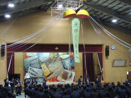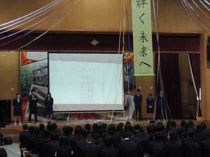 恒例のくす玉割りが行われ,新入生歓迎会は終わりました。113名の新入生を迎え,向島中学校最期の年を全校生徒で盛り上げていきましょう!