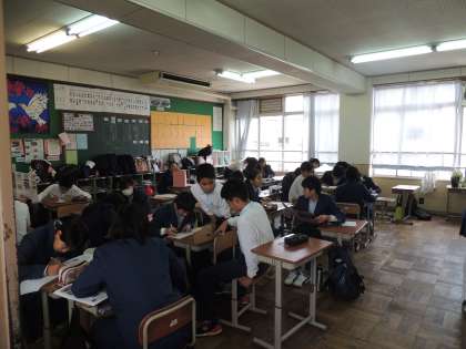 本日9日(水)6限,2,3年生および6組は総合的な学習の時間でした。2年生は「チャレンジ体験」に向けて,各事業所ごとに分かれて,自己紹介文などの書類を作成していました。また,3年生は前回までに様々な高校を調べていました。本日はそれを「高校新聞」としてまとめる作業を行っていました。2年生は4日間の「チャレンジ体験」,3年生は「高校見学」に向けて頑張っていました。