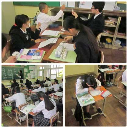 さわやかな天気と「カキーン」という音に誘われてグランドに出てみました。3年生のソフトボールの授業です。そのまま体育館に行くと、女子のバレーボールの授業が行われていました。テスト前は、運動不足になりがちですので、体育の授業ではしっかり身体を動かしておきましょう。1年生も2年生もテスト前ということもあり、一生懸命ノートやプリントに書き込んでいる姿が多く見られました。この週末の家庭学習もこの調子で頑張ってほしいものです。