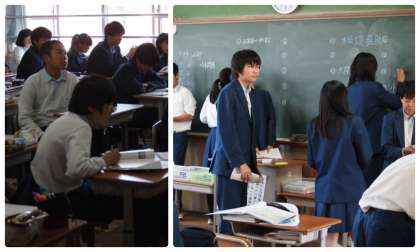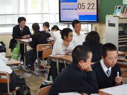 先ほど3年生がテストの話をしていたので,「テスト頑張ってや」と声をかけると,こちらが元気になるようなとびきりの笑顔で「ハイ」という返答が返ってきました。今年の向島中学校キャッチフレーズは,昨年度の「挑戦・感謝・つながり」に「笑顔」を加え,「挑戦・感謝・つながり・笑顔」です。こんな笑顔がいつも見れたらいいなあ・・・そんな一瞬でした。写真は本日の6時間目の様子です。活気のある授業が展開されていました。
