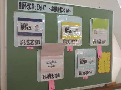 保健室前の掲示物も「睡眠不足になってない?〜8時間睡眠のすすめ〜」ということで,睡眠不足だといろいろなところで不調をきたす内容が掲示されています。今月は「眠育」という非常に大切な内容ですので,保健室前を通るときは,必ず読んでください!