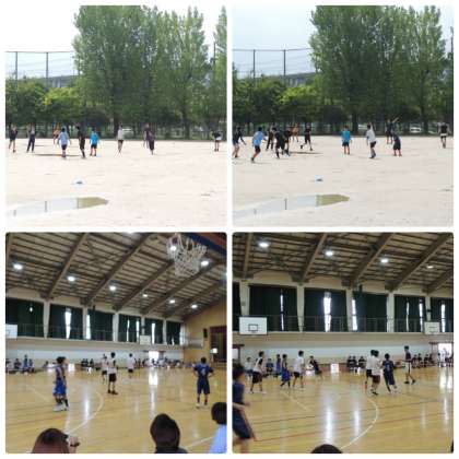 9日(土)午前中の部活動の様子です。グラウンドではラグビー部が練習しています。来週の田んぼラグビーも頑張ってください。体育館では男子バスケットボール部が他校と試合を行っていました。夏季大会の対戦相手も決まったので,部員一丸となって勝利に向けて頑張ってください。