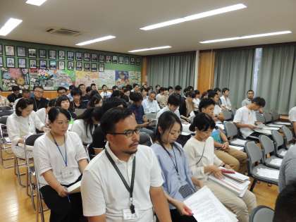 月に一回,向島南小,向島二の丸小,向島中の3校の全教職員が一堂に会し,来年4月の向島秀蓮小中学校開校に向けての会議を行っています。これまでも各部会に分かれて何度も会合を重ねていますが,その各部会の進捗状況を全体で共有し,再度各部会での活動に戻り,さらに作業を進めるということを繰り返しております。小学校の教職員の皆様,警報発令中にもかかわらず中学校までお運びいただきありがとうございました。