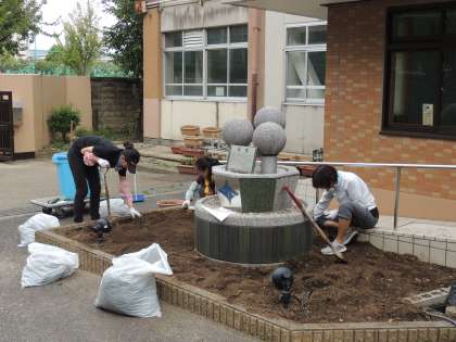 本日6日(木),玄関にある花壇を整備しました。本当にありがとうございました。この後,秋に向けての草花を植えていきます。