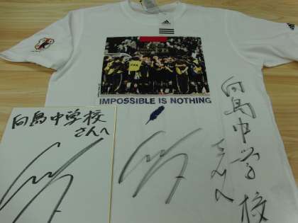 サッカー日本代表の遠藤選手から向島中学校の生徒のみんなにメッセージをもらった。Tシャツには「不可能はない」というメッセージがプリントされ、大きく遠藤選手のサインが書かれている。入試を直前に控えた3年生にとっては、心強い言葉だ。