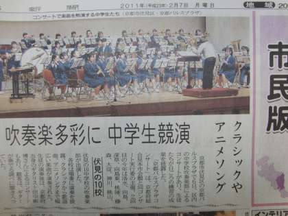 6日パルスプラザにおいて吹奏楽コンサートが行われ、伏見の10校が参加した。京都新聞にはこのことが大きく取り上げられ、本校吹奏楽部が写真で掲載されている。